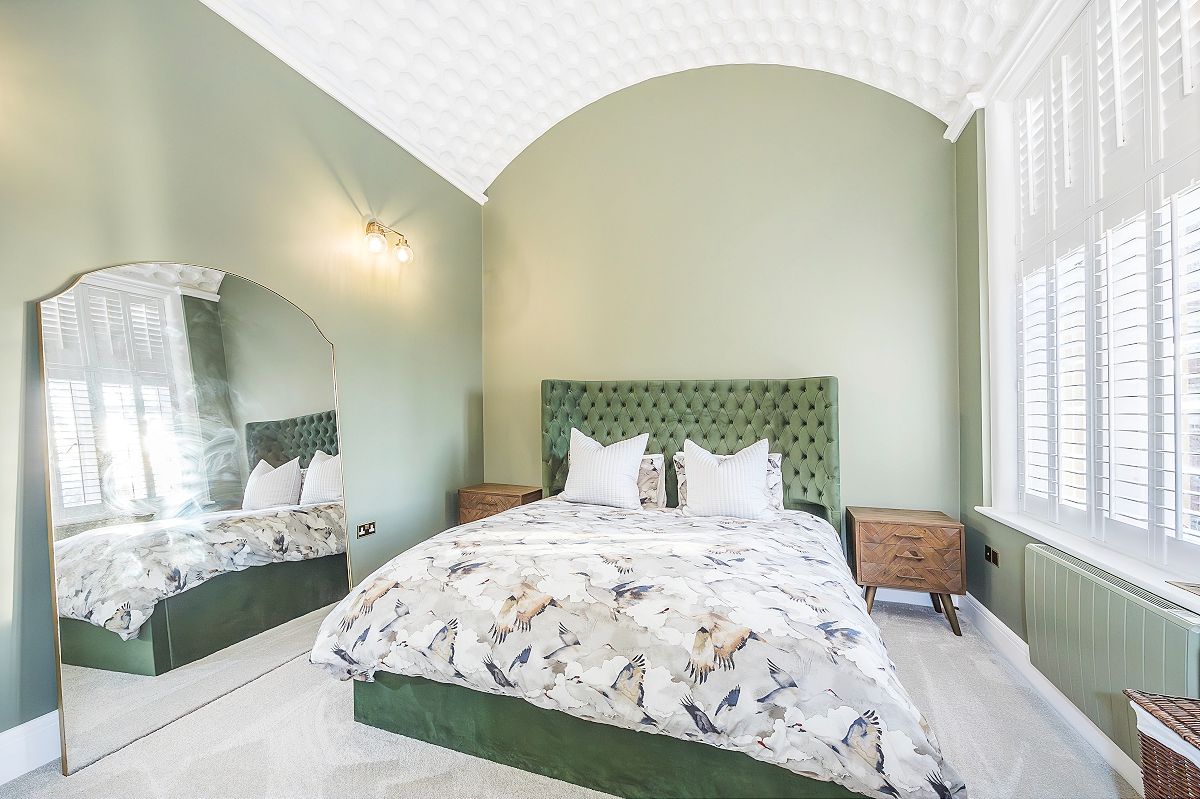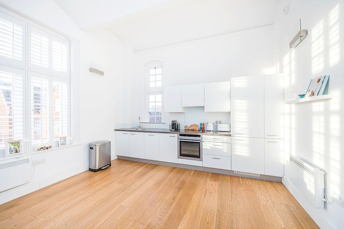 As you enter the apartment there is an L-shaped entrance hall with ample storage and double doors that lead to the open plan reception room which features triple aspect windows, vaulted ceilings and an integrated kitchen. The master bedroom features a vaulted ceiling and built-in wardrobes. Finally, there is a modern three piece family bathroom.